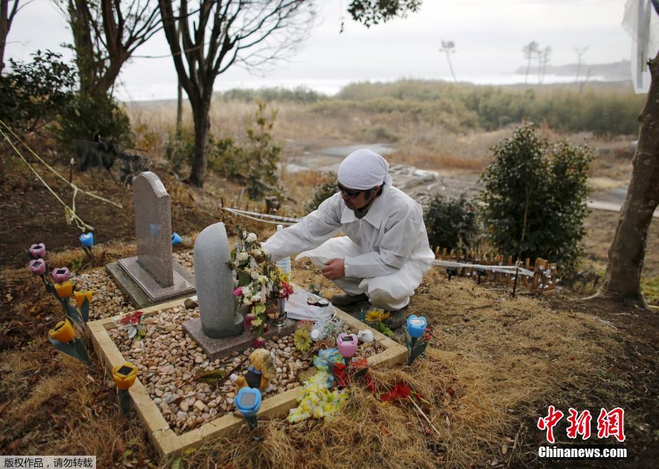 当地时间2月13日,日本福岛,东京电力公司福岛第一核电站附近的禁区里,木村先生给家人的墓更换花束。这是他在家后的山上给家人立的碑。他在五年前的海啸中失去了父亲、妻子和大女儿,小女儿也失踪了。