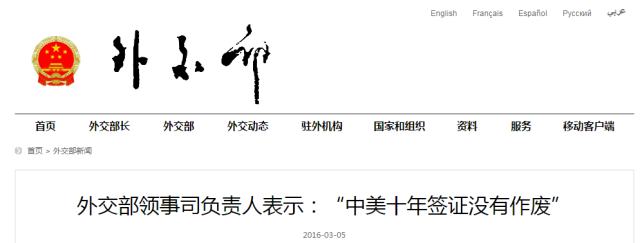 中国外交部网站5日援引外交部领事司消息报道,“中美十年签证没有作废”。