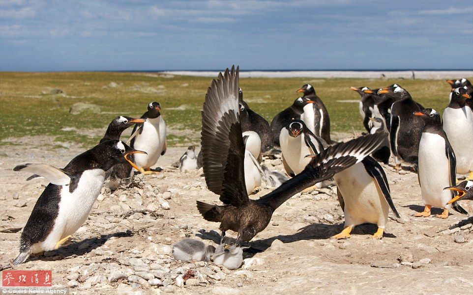贼鸥捕食小企鹅 一群成年企鹅无可奈何(图)