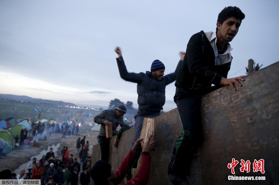 希腊边境滞留难民蜂拥争抢木柴(组图)