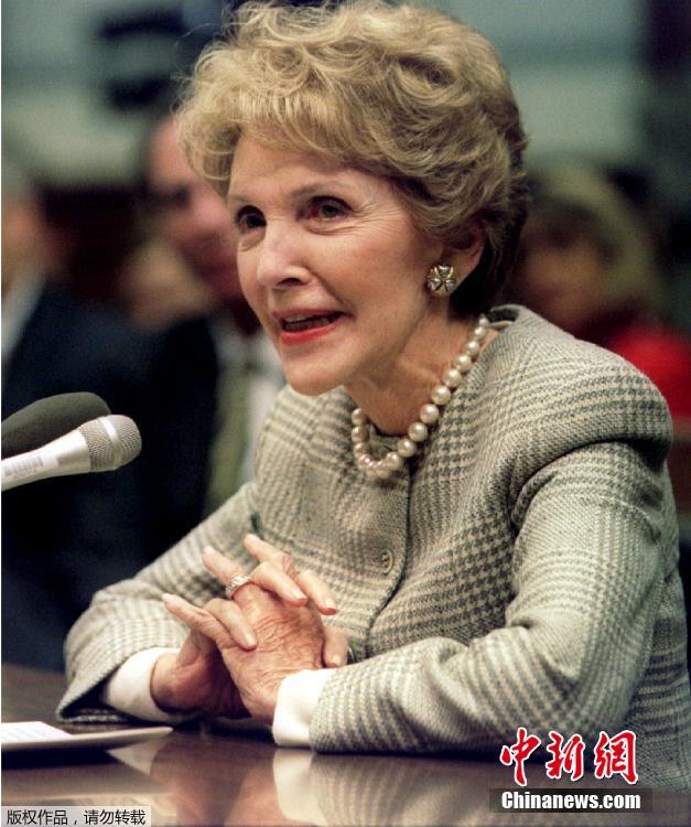 南希·里根生于1921年7月,上世纪40-50年代是名好莱坞演员,1952年与罗纳德·里根成婚,1981年至1989年担任美国第一夫人,1984年曾随罗纳德·里根访华。(资料图)