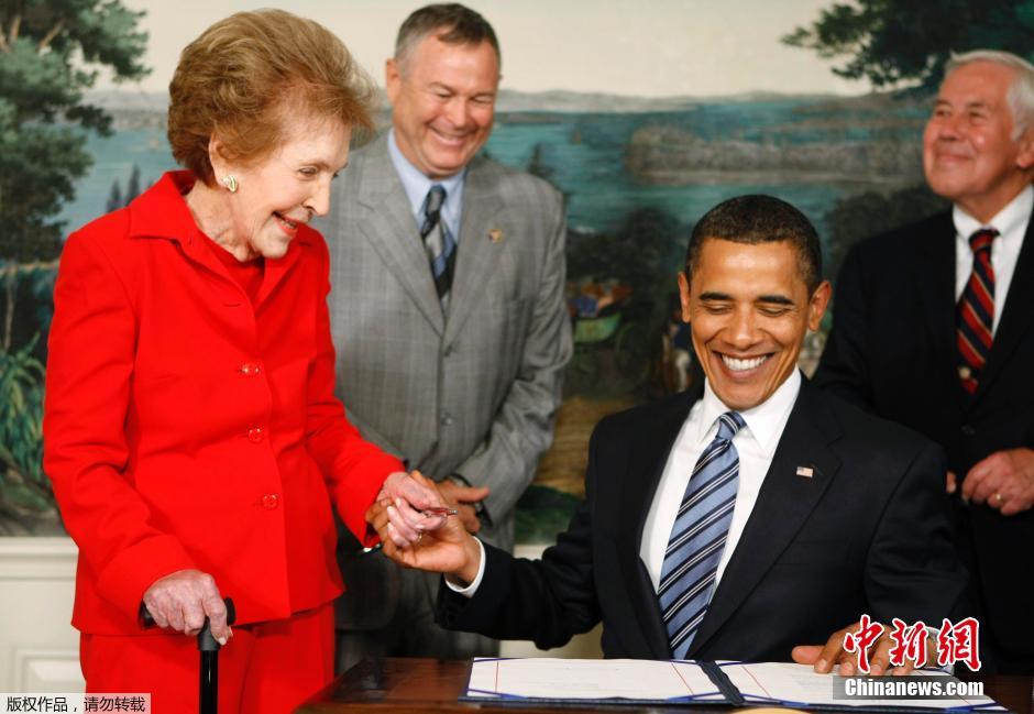图为2009年6月2日,奥巴马在白宫与南希·里根会面。多家美国媒体评价,南希·里根担任第一夫人期间最有影响力的政绩是发起抗击毒品运动,旨在预防和减少青少年群体毒品滥用。(资料图)