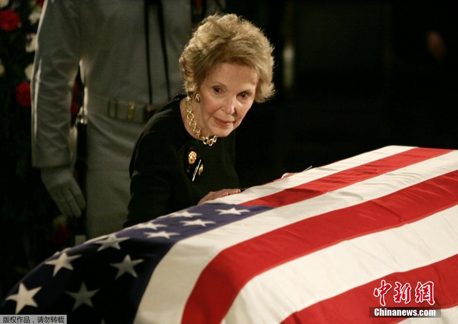 2004年6月9日,南希在丈夫里根的葬礼上。成为第一夫人后的南希·里根曾因其好莱坞式的做派而饱受批评,不过她与里根的忠贞爱情有目共睹,两人从1952年结婚起一直相伴,直到2004年6月5日里根去世。(资料图)