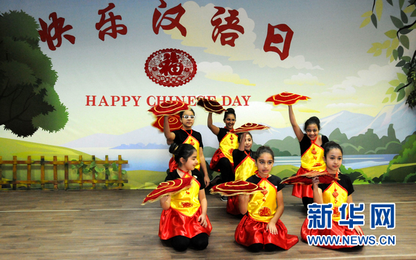 学生在表演手帕舞。新华网记者蒋少清摄