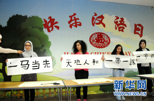 学生在展示现场书写的书法。新华网记者蒋少清摄