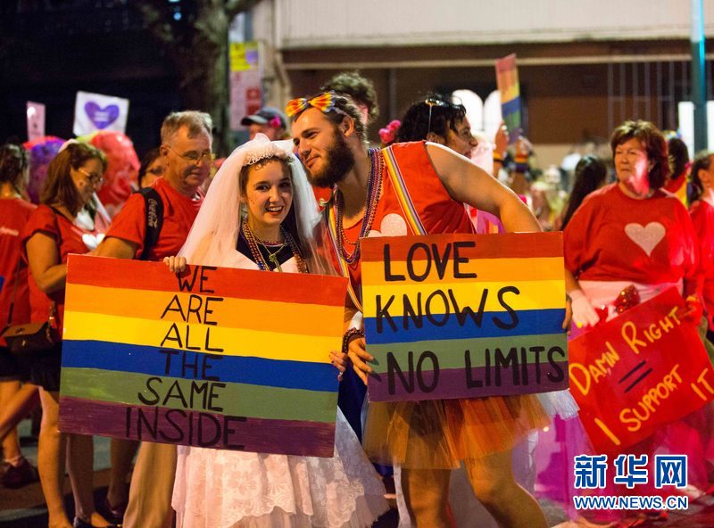 图为两位双性恋者在游行中当日,悉尼同性恋狂欢节花车游行盛大举行。新华网发(朱宏业摄)