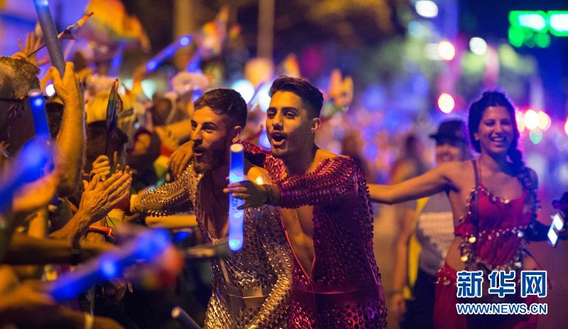 图为两位男同性恋者与观众互动当日,悉尼同性恋狂欢节花车游行盛大举行。新华网发(朱宏业摄)