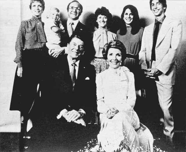 里根的全家福,前排右是夫人南希。后排是女儿莫林(左一),养子迈克尔(左三)和妻子(右三),幼女帕蒂,幼子罗纳德。新华社发