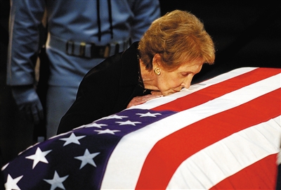 2004年6月11日,南希亲吻覆盖着国旗的里根灵柩。