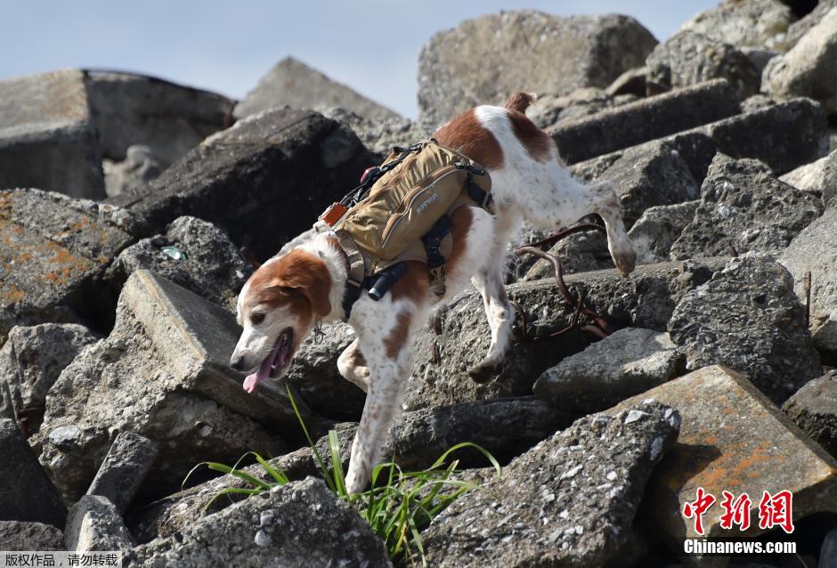 当地时间2月14日,日本富士见市搜救犬Gonta身背导航装置,在瓦砾上进行训练,它曾在2011年日本大地震期间参与搜救。