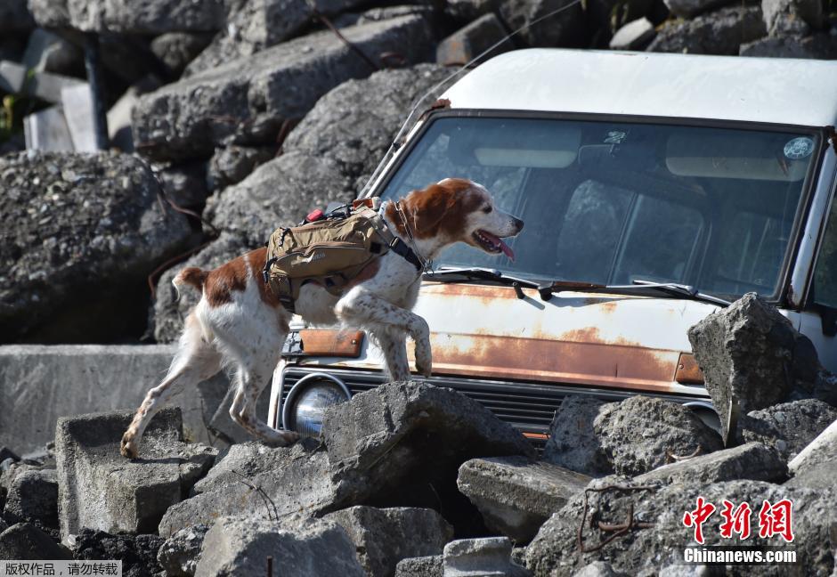 当地时间2月14日,日本富士见市搜救犬Gonta身背导航装置,在瓦砾上进行训练,它曾在2011年日本大地震期间参与搜救。