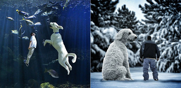 据英国《每日邮报》3月6日报道,美国弗吉尼亚州摄影师克里斯多夫 克莱因(Christopher Cline)用修图软件制作了一组他和爱犬——金毛犬和巨型贵妇犬的混血Juji一起在世界各地畅玩,进行各种挑战的图片,展现了他和爱犬的亲密无间的特殊情意。