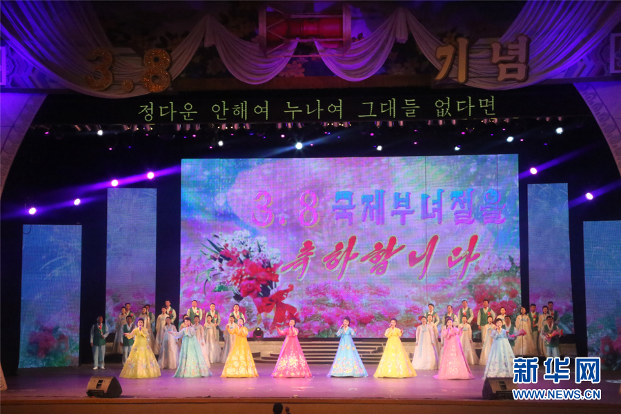 这是3月8日在朝鲜首都平壤拍摄的歌舞演出现场。当日,平壤烽火艺术剧场举行了由朝鲜国立民族艺术团带来的歌舞演出,庆祝“三八”国际劳动妇女节。模范女性代表、驻朝使团、国际机构代表和外国人士等观看了表演。新华社记者陆睿摄