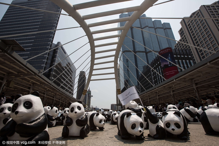 当地时间2016年3月8日,泰国曼谷,Chong Nonsi桥上展出法国艺术家Paulo Grangeon创作的大熊猫雕塑。这1600只纸熊猫象征着最后在野外生存的1600只大熊猫。(Reuters/视觉中国)