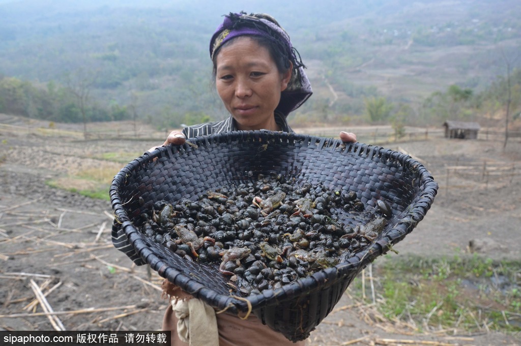当地时间2016年3月7日,印度,印度山地民族Naga部落妇女下水田捕获青蛙和蜗牛。对于这个部落的人们来说,青蛙、蚂蚱、蜗牛等生物是非常美味的,并成为他们的日常饮食的一部分,主要是从稻田水田中捕获,并可以以高价销往市场。Sipaphoto