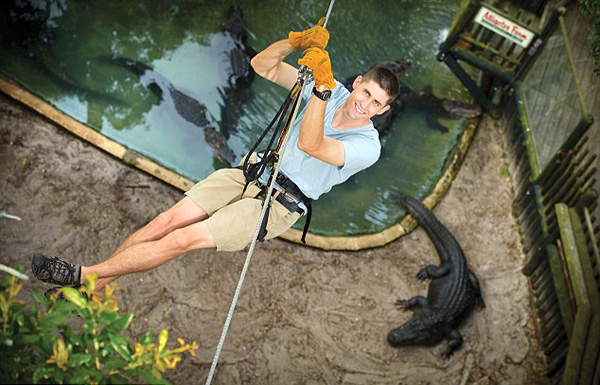 园区内共饲养了24种不同种类的鳄鱼,游客在飞跃鳄鱼池的同时能够观赏到短吻鳄、恒河鳄和凯门鳄等许多不同品种的鳄鱼。为保证安全,每位游客在乘吊索前都会系上至少两根安全绳。这一独特的体验项目自开放以来便异常火爆,在过去5年间,每年参与的游客都将近20万,成为园区的一大特色。