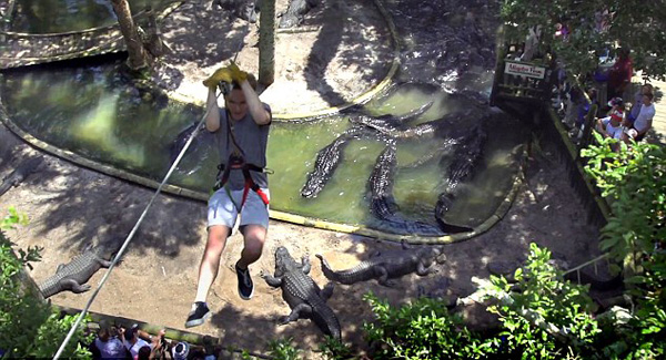 据英国《每日邮报》3月8日报道,美国佛罗里达州的圣奥古斯丁鳄鱼养殖场动物园为游客提供的一种丛林飞索项目可谓惊险非常。从鳄鱼池上空乘吊索飞跃,俯瞰身下凶猛的鳄鱼,充满刺激的体验吸引了大批游客前往。