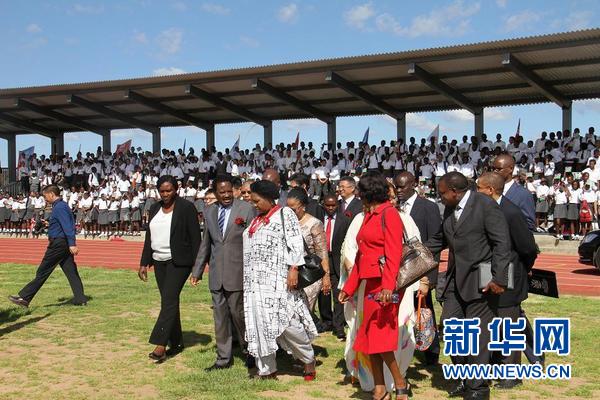 3月9日纳米比亚官员走入位于首都温得和克的毛泽东主席中学校园会场。新华网记者吴长伟摄