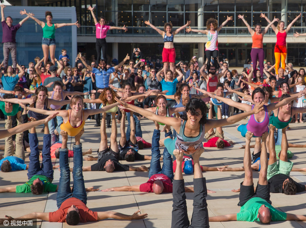 以色列民众参加杂技瑜伽快闪 高难度健身惊爆眼球(组图)