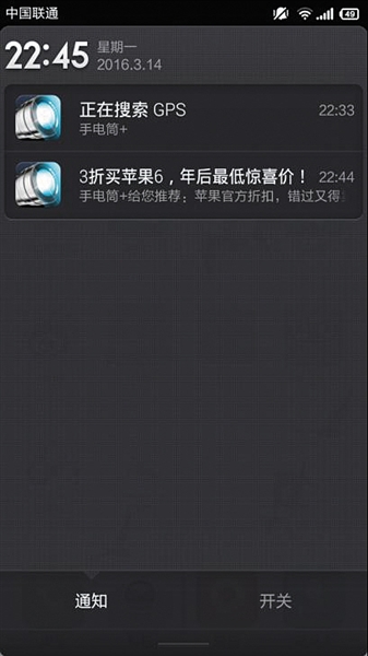 而记者下载另一款名为“手电筒+”APP后,其权限包括写入网络书签和历史记录等。在安装11分钟后,记者的手机通知栏里连续出现两则同样的广告,“3折买苹果6,年后最低惊喜价!”
