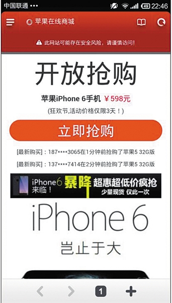 点击后进入一个名为“苹果在线商城”的网站。页面信息显示,iPhone6抢购价仅为598元。同时手机浏览器发来自动提醒:“此网站可能存在安全风险,请谨慎访问!”