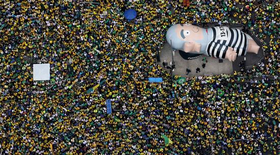 游行民众高举前总统卢拉的人形气球,他因发展经济得力受到巴西民众爱戴。卢拉因涉嫌受贿于3月4日被警方带走协助调查。(网页截图)