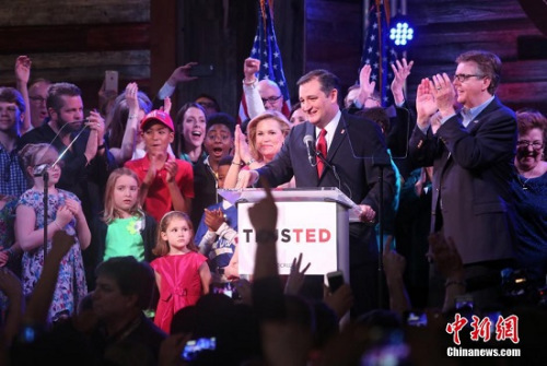 当地时间3月1日,美国总统大选党内初选“超级星期二”在多州同时展开,在党代表票数最多的得克萨斯州,参议员克鲁兹以43.7%的得票率主场击败竞选对手特朗普和鲁比奥。图为克鲁兹当晚在休斯敦的观票会上发表获胜感言,感谢得州的支持者。