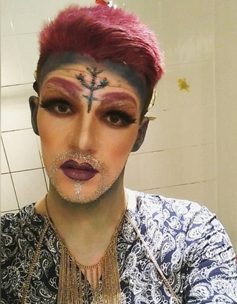 大胡子还常与传统民族服饰混搭,比如印度范儿的“变装皇后”,身穿纱礼服,眉心点红痣,当然,也留着大胡子。