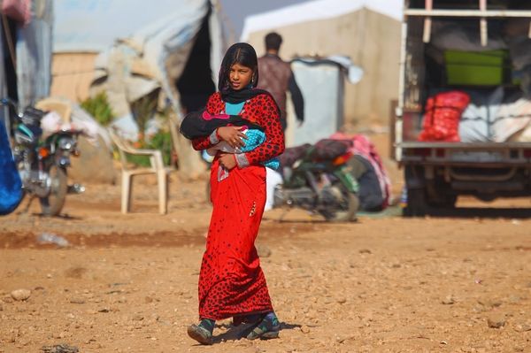 2015年11月20日,叙利亚伊德利卜省辛贾尔难民营,一名无家可归的女孩怀抱婴儿。