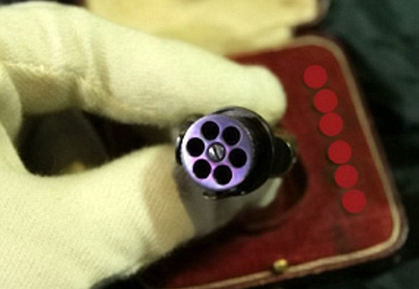 这是一把极其罕见的19世纪风格的法国指环枪,同时也是首款登记在册的指环枪,可以被当做首饰戴在手上。它的底座是一块金属板,金属板上面是用来放置子弹的左轮弹夹,每个弹孔可装入直径四毫米的微型子弹。