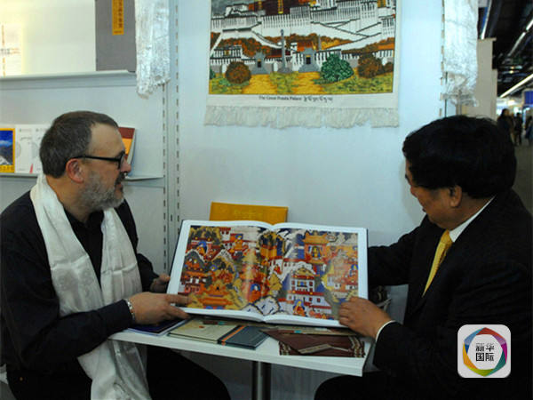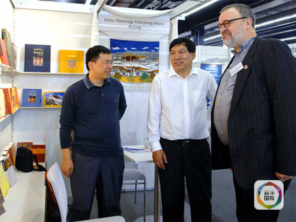 图为中国藏学出版社社长周华(右)在德国法兰克福书展上向南因果介绍藏学新书。(新华社发)