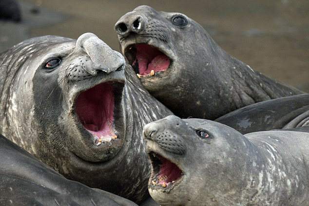 一群象海豹扯开嗓子拼唱功的图片真是滑稽极了!英国《每日邮报》3月16日发布了一组有趣的图片,记录了象海豹们头微微向后仰,张大嘴巴,试图模仿明星们的可爱画面。