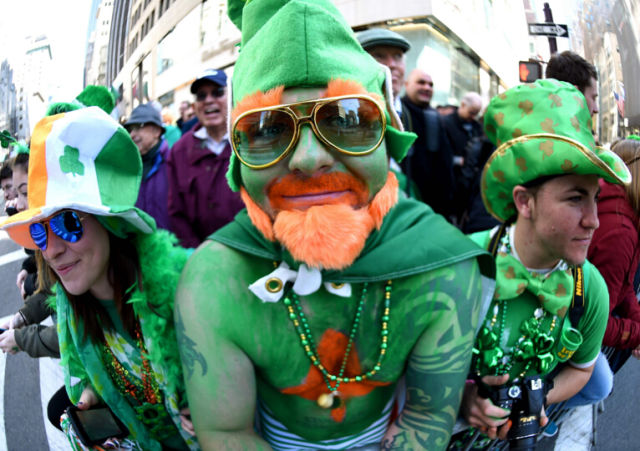3月17日,在美国纽约,人们穿戴绿色的服饰参加圣帕特里克节庆祝活动。(新华/法新)