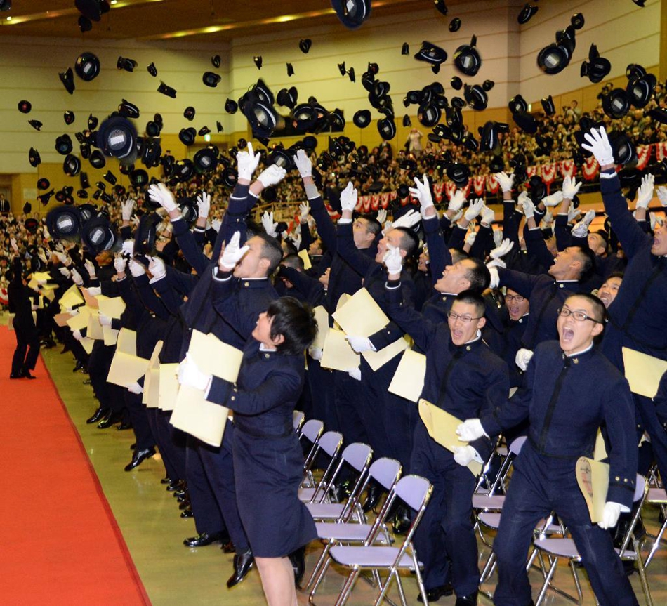 当地时间21日上午,位于神奈川县横须贺市的防卫大学举行春季毕业典礼。图为毕业典礼结束后,现场毕业生一同将帽子抛掷空中庆祝毕业。(网站截图)
