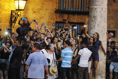 20日,在古巴哈瓦那老城,游客和当地居民围观奥巴马一家。