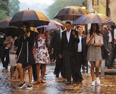 当地时间20日,古巴下着毛毛雨,奥巴马一行打着伞从空军一号上下来。古巴外交部长罗德里格斯前往机场迎接,为表欢迎,他向与奥巴马同行的第一夫人米歇尔和两个女儿送上了鲜花。