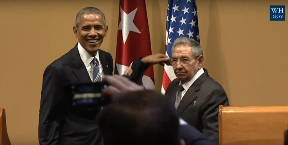 这一尴尬的场景发生在奥巴马和劳尔·卡斯特罗在古巴革命宫召开的新闻发布会上。发布会结尾,奥巴马在二人都结束致辞之后试图找卡斯特罗握手并,举手致意方便媒体拍照,没想遭遇尴尬一幕:卡斯特罗不知出于什么原因没有和奥巴马握手,而是抓住奥巴马的胳膊举了起来。