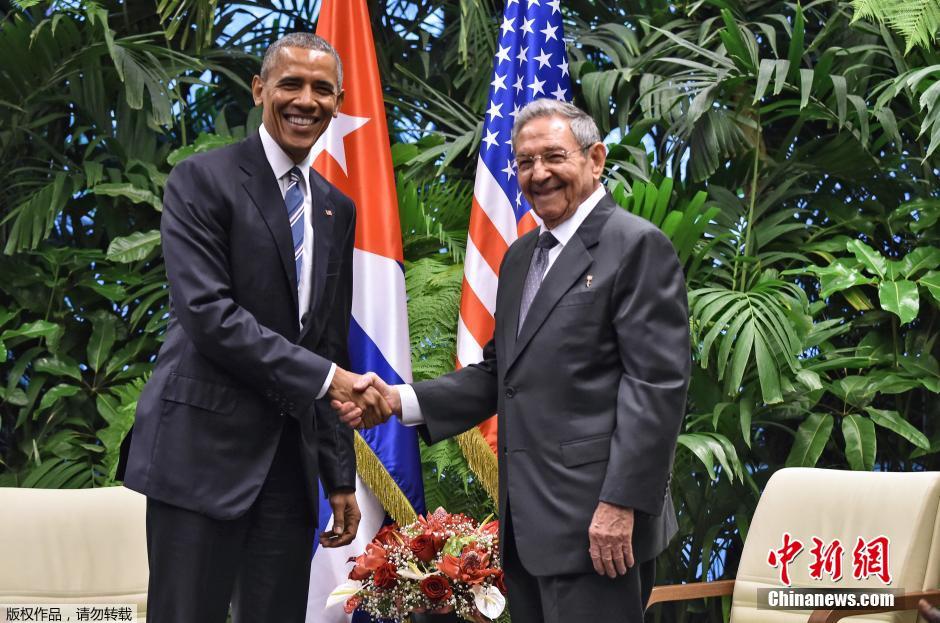 当地时间2016年3月21日,古巴哈瓦那,美国总统奥巴马与古巴领导人劳尔·卡斯特罗会晤。