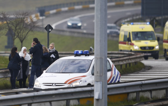 ↑3月22日,在比利时首都布鲁塞尔,从机场撤离的乘客互相安慰。新华社记者叶平凡摄
