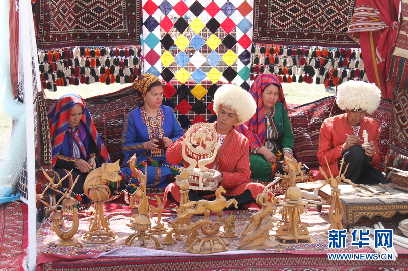 3月21日,在土库曼斯坦首都阿什哈巴德,当地人在做手工饰品。新华社记者卢敬利 摄