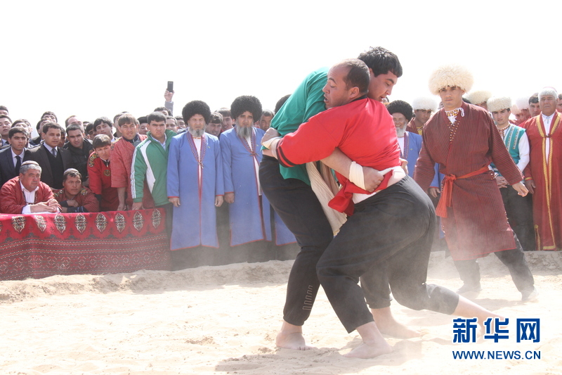 3月21日,在土库曼斯坦首都阿什哈巴德,现场进行摔跤比赛。新华社记者卢敬利 摄