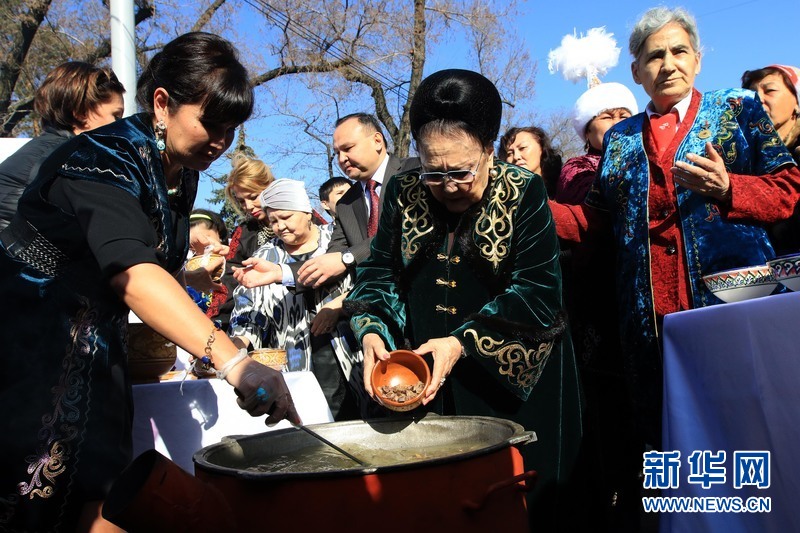 3月22日,哈萨克斯坦南部城市阿拉木图举行盛大文娱活动,庆祝哈萨克人传统佳节纳乌鲁斯节。人们纷纷品尝纳乌鲁斯节主要美食——纳乌鲁斯粥。新华网发(米赫耶夫摄)