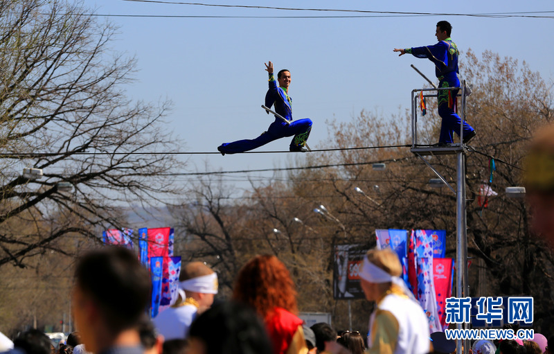 3月22日,哈萨克斯坦南部城市阿拉木图举行盛大文娱活动,庆祝哈萨克人传统佳节纳乌鲁斯节。节日期间,哈萨克艺人表演高空走钢丝。新华网发(米赫耶夫摄)