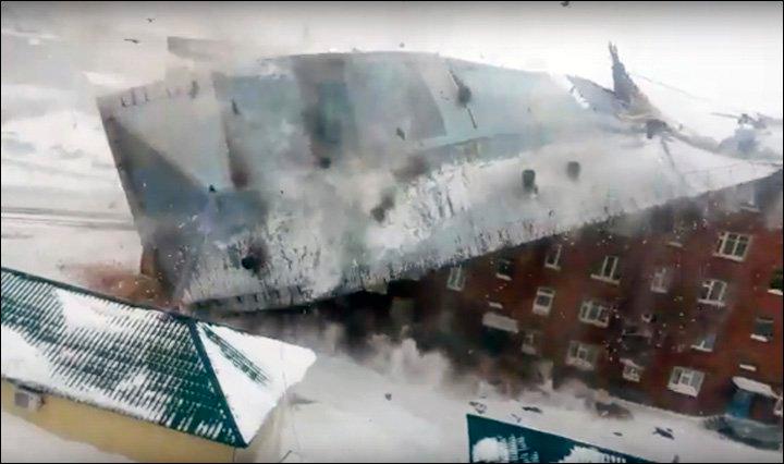 3月21日俄媒报道,在俄罗斯北极地区杜金卡市,一栋5层公寓楼的屋顶被狂风整个掀掉。所幸的是事件并没有造成人员伤亡,但巨大的屋顶被吹落的景象却把许多人吓坏了。屋顶被掀掉其实并不是大风直接吹的,当狂风发生时,屋顶上方空气流速大,下方(室内)空气流速小;因为流体流速大的地方压强小,所以会对屋顶有一个向上的压强差,屋顶会被掀翻。
