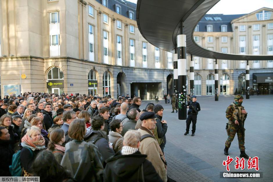 在布鲁塞尔中央车站外,等待进站的乘客。连环爆炸发生后,比利时全国安全警戒级别提升至最高级。