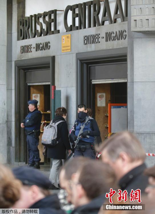 经过安检的乘客进入布鲁塞尔中央火车站。外媒称,布鲁塞尔正在力争恢复地面公共交通,但地铁系统还将关闭一段时间。