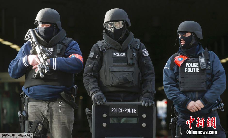 布鲁塞尔迷笛火车站外,全副武装的警察。