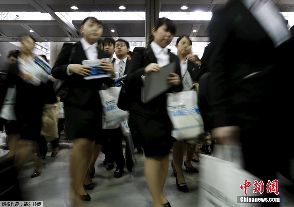 当地时间2016年3月20日,日本东京,当地举办毕业生招聘会,求职者穿着整齐划一的黑白职业装聚集在招聘会现场,十分壮观。