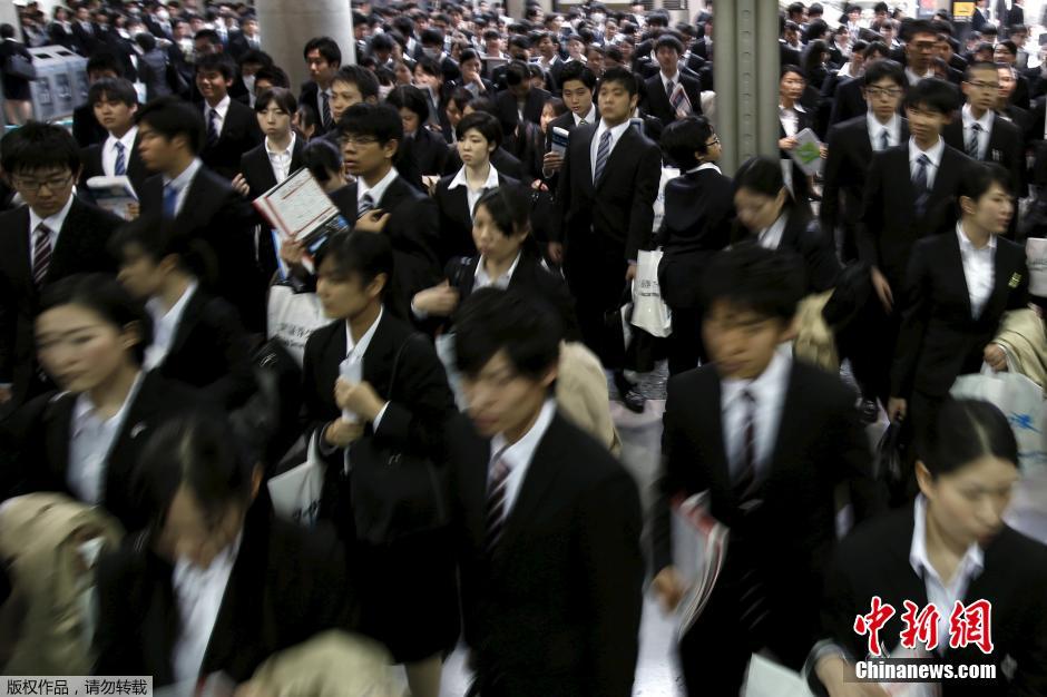 当地时间2016年3月20日,日本东京,当地举办毕业生招聘会,求职者穿着整齐划一的黑白职业装聚集在招聘会现场,十分壮观。