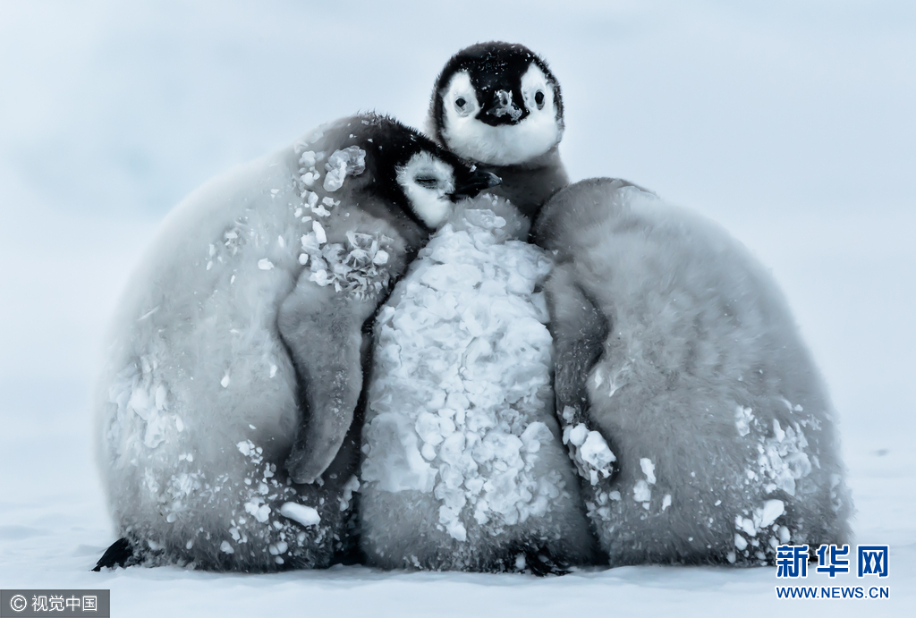 52岁的德国食品工程师Gunther Riehle在南极洲捕捉到一群三个月大的小企鹅在暴风雪中抱团取暖的画面,小企鹅闭着眼睛缩成一团,相互依偎在一起抵御寒冷。图片来源:视觉中国